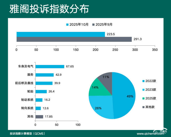 汽车质量投诉点评:本月雅阁继续下撤,投诉指数环比下滑23.27%,除了被车主持续投诉的吃胎偏慢问题外,2023款和2025款车型上又爆发出不少新问题,例如不少车主反馈尾灯存在开裂问题,多被4S店以外部原因造成为由推向自费维修;还有车主反馈中控屏出现开胶情况,同样被拒绝保修,日系车的质量神话正在落幕。