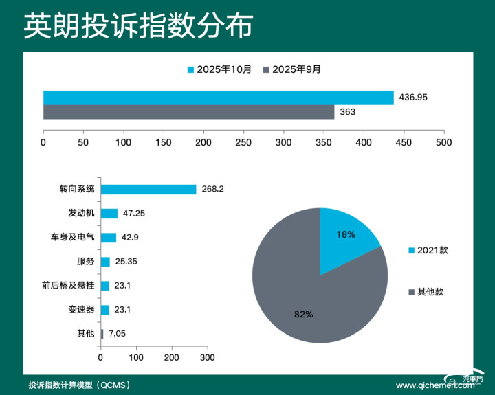 汽车质量投诉点评:本月英朗以20.37%的投诉指数涨幅回归首位,这已经是英朗投诉指数连续两月出现大幅上涨,车主投诉的焦点还是转向沉重异响的老问题,涉及车辆多、召回范围有限,是该投诉问题反复出现的主要原因。特别是目前上汽通用在国内已经日薄西山,不仅对新车的推进不积极,对质量问题更是不管不问,这造成很多车主投诉无门。